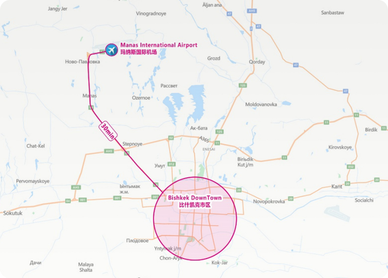 • 乘飞机到玛纳斯国际机场,开车30分钟